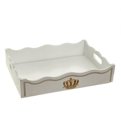 Organizese com essa bandeja confeccionada, especialmente, para levar praticidade e versatilidade para as mamães e com muito estilo. Afinal toda a magia da ambientação se manifesta através desses toques decorativos, que não podemos abrir mão Dados Técnicos Bandeja em madeira MDF e pintura laqueada branca. Detalhe com pérolas amarelas e corôa em resina dourada. Medidas Largura: 26 cm Comprimento: 35 cm Altura: 8 cm