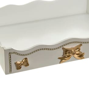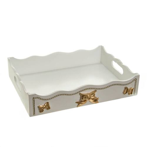 Organizese com essa bandeja confeccionada, especialmente, para levar praticidade e versatilidade para as mamães e com muito estilo. Afinal toda a magia da ambientação se manifesta através desses toques decorativos, que não podemos abrir mão Dados Técnicos Bandeja em madeira MDF e pintura laqueada branca. Detalhe com pérola amarela laços dourados. Medidas Largura: 26 cm Comprimento: 35 cm Altura: 8 cm
