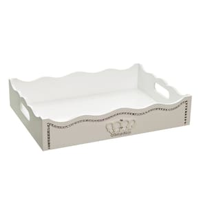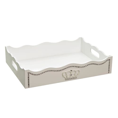 Organizese com essa bandeja confeccionada, especialmente, para levar praticidade e versatilidade para as mamães e com muito estilo. Afinal toda a magia da ambientação se manifesta através desses toques decorativos, que não podemos abrir mão Dados Técnicos Bandeja em madeira MDF e pintura laqueada branca. Detalhe com strass corôa com strass. Medidas Largura: 26 cm Comprimento: 35 cm Altura: 8 cm