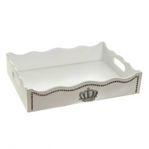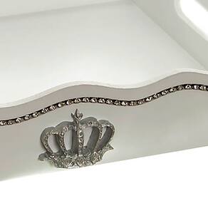 Bandeja em madeira MDF com pintura laqueada e decoração com strass e corôa de resina.