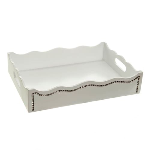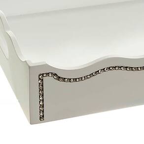 Organizese com essa bandeja confeccionada, especialmente, para levar praticidade e versatilidade para as mamães e com muito estilo. Afinal toda a magia da ambientação se manifesta através desses toques decorativos, que não podemos abrir mão Dados Técnicos Bandeja em madeira MDF e pintura laqueada branca. Detalhes em strass. Medidas Largura: 26 cm Comprimento: 35 cm Altura: 8 cm