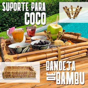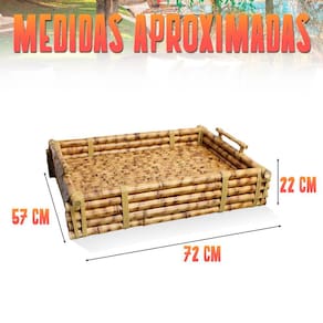 BANDEJA DE BAMBU NATURAL COM ALÇAS E PORTA COCO CESTO DECORATIVOA Bandeja de Bambu e o Suporte para Coco são objetos para serem utilizados como decoração ou para servir, combinando com diversos ambientes, pois têm estilo sofisticado e rústico ao mesmo tempo.Combinando tanto com ambientes internos quanto externos, o bambu é um material ecológico e sustentável, resistente à água, ideal para beira de piscinas em casas, hotéis, pousadas e resorts.A bandeja também é flutuante. Contando com placa de isopor no fundo, ela pode ir para as piscinas para deixar os momentos de lazer repletos de requinte e glamour.DIMENSÕES APROXIMADAS DA BANDEJA:- Comprimento: 72cm- Largura: 57cm- Altura: 22cmDIMENSÕES APROXIMADAS DO PORTA COCO:- Comprimento: 21cm- Largura: 13cm- Altura: 13cmCARACTERÍSTICAS:- Material da bandeja: bambu, cipó sintético e placa flutuante de isopor no fundo- Material do porta coco: bambu e cipó sintético- Cestos artesanais feitos com alto padrão de qualidade- Ecológico e sustentável- Ideal para servir ou decorar- Excelente para áreas de lazer, piscinas, pousadas, hotéis, resorts e decoração de casa- Peso suportado pela bandeja aproximadamente: 8KgITENS INCLUSOS:- 01 Bandeja de Bambu Grande- 01 Suporte Porta CocoOBSERVAÇÕES:- Garantia de 3 meses contra defeitos de fabricação- Imagens ilustrativas- Não nos responsabilizamos pelo uso inadequado do produtoNão deixe de conhecer nossos outros produtos! Marca: IGUANNA