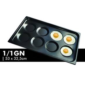 Especificações Técnicas: Tamanho: GN 1/1 Medidas : 530 mm x 325 mm Material : Aço carbono revestido com Teflon Capacidade: 8 cavidades para ovos menor