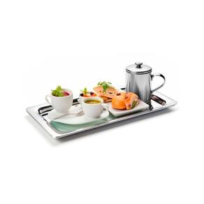 Bandeja inox café retangular 30x15cm Hotel Cafeteria Um luxo de Bandeja para Servir bebidas, pratos, organizar itens com elegância, praticidade de maneira sofisticada. Com 30 cm de diâmetro e feita em aço inoxidável, combina resistência com um acabamento polido que valoriza a apresentação, material resistente e fácil de limpar, pois não possui porosidades. Seja em ocasiões especiais, reuniões ou uso diário, esta bandeja é prática e durável, adicionando um toque e refinado seja qual for seu ambiente. Dimensões da embalagem comprimento: 30,5 largura: 15 altura: 1 cm . Marca: Não Informado