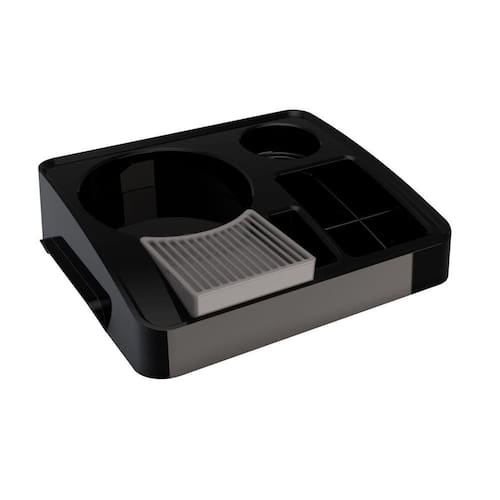 Cor: Preto; Medidas: 28cm X 24cm; Material: Peças em plástico injetado (PP); Pingadeira removível para evitar sujeira; Porta garrafa adaptável para garrafas de 1l e 1,8l; Porta copos para os tamanhos mais s; Porta colheres; Diferentes compartimentos para sachês de chá, café solúvel, açúcar, entre outros.