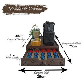 Nossa bandeja é feita em MDF bi-laminado de alta qualidade; Possui espaço para sua cafeteira e também xícaras na parte superior. Além disso, possui uma gaveta, com capacidade para 45 cápsulas.