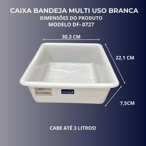 Caixa Bandeja Multi uso branca 3 litros A bandeja de polipropileno Bioprátika Multi uso é um item indispensável para qualquer estabelecimento, seja ele uma cozinha doméstica ou industrial, refeitórios, padarias, pastelarias, lanchonetes ou mercados. Confeccionada em plástico polipropileno, esta bandeja não contém bisfenol, tornando-a uma opção segura e saudável para o armazenamento de alimentos. Com medidas externas aproximadas de 30,3 cm de comprimento, 22,1 cm de largura e 7,5 cm de altura, a bandeja é retangular, o que facilita o armazenamento e organização. O modelo DF-0727, da marca daifpro, é versátil e funcional, sendo ideal para armazenar carne, peixe, frango, , legumes, frutas e até mesmo objetos. Além disso, a bandeja é apta para uso em lava-louças, o que facilita a limpeza e manutenção Diária. No entanto, não possui pés dobráveis. A bandeja de polipropileno Bioprátika Multi uso é perfeita para uso em freezers e microondas, tornando-a uma opção prática e eficiente para o dia a dia. ESPECIFICAÇÕES Comprimento: 30,3cm Largura: 22,1cm Altura: 7,5cm Capacidade: 3 Litros