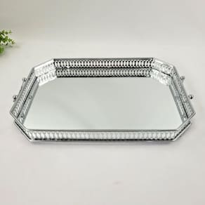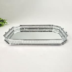 Bandeja Retangular Espelhada Cromada Prateada Decoração Bandeja Decorativa de Metal Prata com Espelho e Alça Ajustável Inigual Decor Adicione um toque de sofisticação e funcionalidade ao seu ambiente com a Bandeja Decorativa de Metal Prata com Espelho e Alça Ajustável da Inigual Decor. Perfeita para organizar e exibir seus itens favoritos, esta peça é um coringa na decoração, combinando beleza e praticidade. Confeccionada em metal resistente na cor prata, esta bandeja possui um acabamento elegante que confere um brilho sutil ao ambiente. Sua base espelhada não só adiciona um toque de glamour, como também reflete a luz, criando a sensação de um espaço mais amplo e luminoso, além de realçar a beleza dos objetos sobre ela. O grande diferencial é a alça ajustável, que permite adaptá-la conforme a sua necessidade ou preferência, seja para transporte ou para um detalhe decorativo diferenciado. Com 4 cm de altura, 37 cm de largura e 25 cm de profundidade, esta bandeja tem o tamanho ideal para ser Utilizado em mesas de centro, aparadores, bares, penteadeiras ou banheiros. Com um peso de 820g, ela oferece a solidez necessária para o uso diário, sem perder a leveza visual. É a escolha perfeita para quem busca um item que une estilo, versatilidade e um toque de luxo na organização e decoração. Por Que Escolher a Bandeja Decorativa Inigual Decor Design Elegante e Moderno: Combinação de metal prata e espelho que adiciona sofisticação e brilho. Funcionalidade Versátil: Ideal para servir, organizar joias, perfumes ou criar composições decorativas. Alça Ajustável: Oferece flexibilidade no uso e um detalhe prático para transporte. Material de Qualidade: Fabricada em metal durável e espelho, garantindo longevidade e resistência. Efeito Luminoso: A base espelhada reflete a luz e amplia visualmente o espaço. Especificações do Produto: Altura Aproximada: 4,0 cm Largura Aproximada: 37,0 cm Profundidade Aproximada: 25,0 cm Peso: 820 g Material: Metal e Espelho Cor: Prata Conteúdo da Embalagem: 1 Bandeja Decorativa Importante: Limpe delicadamente com um pano macio e seco. Evite o uso de produtos abrasivos para preservar o brilho do metal e do espelho. Manuseie com cuidado para evitar arranhões no espelho. Observação: As imagens são ilustrativas. Os demais itens decorativos exibidos nas fotos não acompanham o produto. Marca: Não Informado Ean: 7908236074273