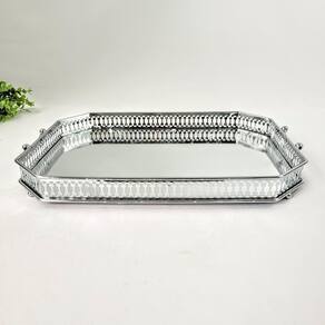 Bandeja Retangular Espelhada Cromada Prateada Decoração Bandeja Decorativa de Metal Prata com Espelho e Alça Ajustável Inigual Decor Adicione um toque de sofisticação e funcionalidade ao seu ambiente com a Bandeja Decorativa de Metal Prata com Espelho e Alça Ajustável da Inigual Decor. Perfeita para organizar e exibir seus itens favoritos, esta peça é um coringa na decoração, combinando beleza e praticidade. Confeccionada em metal resistente na cor prata, esta bandeja possui um acabamento elegante que confere um brilho sutil ao ambiente. Sua base espelhada não só adiciona um toque de glamour, como também reflete a luz, criando a sensação de um espaço mais amplo e luminoso, além de realçar a beleza dos objetos sobre ela. O grande diferencial é a alça ajustável, que permite adaptá-la conforme a sua necessidade ou preferência, seja para transporte ou para um detalhe decorativo diferenciado. Com 4 cm de altura, 37 cm de largura e 25 cm de profundidade, esta bandeja tem o tamanho ideal para ser Utilizado em mesas de centro, aparadores, bares, penteadeiras ou banheiros. Com um peso de 820g, ela oferece a solidez necessária para o uso diário, sem perder a leveza visual. É a escolha perfeita para quem busca um item que une estilo, versatilidade e um toque de luxo na organização e decoração. Por Que Escolher a Bandeja Decorativa Inigual Decor Design Elegante e Moderno: Combinação de metal prata e espelho que adiciona sofisticação e brilho. Funcionalidade Versátil: Ideal para servir, organizar joias, perfumes ou criar composições decorativas. Alça Ajustável: Oferece flexibilidade no uso e um detalhe prático para transporte. Material de Qualidade: Fabricada em metal durável e espelho, garantindo longevidade e resistência. Efeito Luminoso: A base espelhada reflete a luz e amplia visualmente o espaço. Especificações do Produto: Altura Aproximada: 4,0 cm Largura Aproximada: 37,0 cm Profundidade Aproximada: 25,0 cm Peso: 820 g Material: Metal e Espelho Cor: Prata Conteúdo da Embalagem: 1 Bandeja Decorativa Importante: Limpe delicadamente com um pano macio e seco. Evite o uso de produtos abrasivos para preservar o brilho do metal e do espelho. Manuseie com cuidado para evitar arranhões no espelho. Observação: As imagens são ilustrativas. Os demais itens decorativos exibidos nas fotos não acompanham o produto. Marca: Não Informado