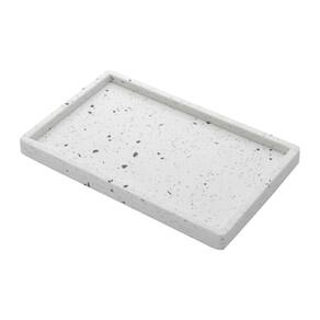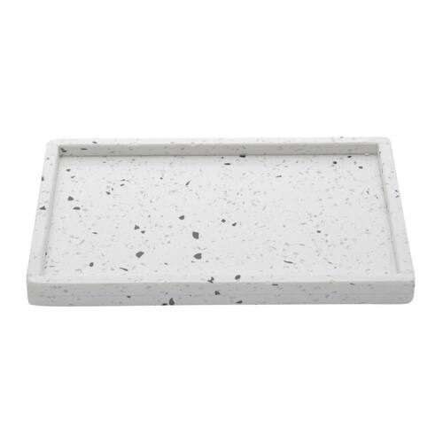 Linda bandeja em granilite, nas cores preto, branco e gelo, borda elevada no mesmo material com pés emborrachados ante derrapantes.