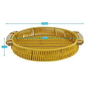 Bandeja Trama Tipo Vime Artificial Redonda Alça de Madeira Cor: Amarelo Adicione um toque de charme à sua casa com a Bandeja Trama Tipo Vime Artificial Redonda com Alça de Madeira Perfeita para servir petiscos, bebidas ou para organizar pequenos itens, essa bandeja combina a beleza do vime com a rusticidade da madeira. Sua alça facilita o transporte, tornando-a ideal para festas e reuniões familiares.