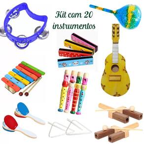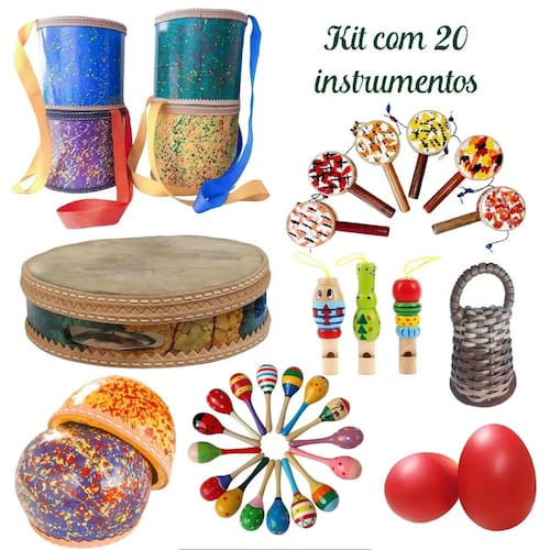 1 Xilofone de madeira com duas baquetas 1 Raquete de madeira 1 Reco reco de madeira 1 Apito de animais 1 Castanhola com cabo em madeira 1 Triângulo 1 Maracá em PVC e cabo em madeira 1 Maracá em madeira pequeno 1 Chocalho de platinela e cabo de madeira 1 Pandeiro de couro 1 Tambor de couro com alça e duas baquetas 1 Kabuletê 1 Flauta de madeira 1 Agogô de madeira 1 Par de coquinhos 1 Gaita 1 Caxixi 1 Par de eggs 1 Viola artesanal de madeira 1 Meia Lua infantil