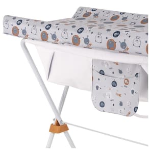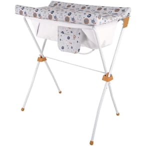 Possui um amplo tampo de plástico com trocador acolchoado onde a mamãe pode secar e vestir o bebê confortavelmente. Acompanha mangueira para escoar a água da banheira, saboneteira que pode ser usado como porta objeto.