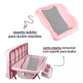 Informações Técnicas: - Capacidade Máxima do Suporte: 20kg (10kg criança + 10 litros de água) - Trocador: Estofado macio e suave ao toque. - Assento Redutor: Indicado para recém-nascidos. - Porta-Objetos: Removível, com suporte para toalha. - Gancho: Para armazenamento conveniente da cuba da banheira. - Mangueira: Para escoamento prático de água.