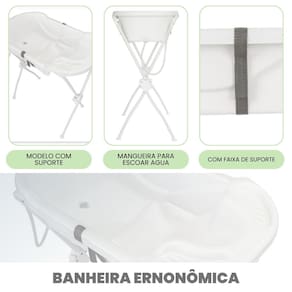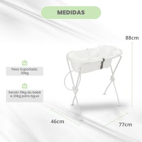 Características Destacadas: - Cor: Branco elegante, combinando com qualquer decoração de banheiro. - Estrutura Robusta: Feita com aço tubular Ø3/4" e acabamento em pintura epóxi/poliéster, garantindo durabilidade e estabilidade. - Material de Alta Qualidade: Banheira de plástico de engenharia PP (polipropileno), seguro e fácil de limpar. - Mangueira de Escoamento: Facilita a remoção da água após o uso, tornando a limpeza simples e rápida. - Capacidade: Suporta até 30Kg, permitindo o uso desde recém-nascidos até crianças de 2 anos.