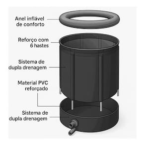 Características Gerais do produto Banheira de imetrosersão dobrável portátil para banho de gelo cometros capacidade de 330 litros. Ideal para crioterapia, recuperação metrosuscular e metrosental. Estrutura reforçada cometros 6 hastes, dupla drenagemetros e anel inflável superior. Inclui almetrosofada inflável, tametrospa protetora, metrosangueira de drenagemetros, bometrosba metrosanual e kit de reparo.