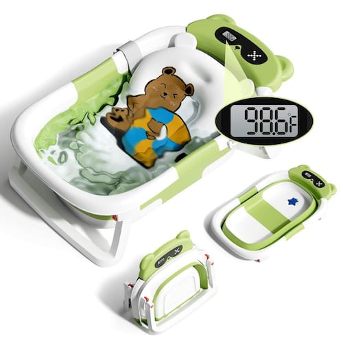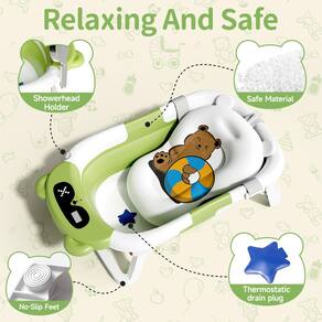 Banheira dobrável para bebês - Design dobrável: diga adeus às banheiras volumosas para bebês! Nossa banheira dobrável para bebês apresenta um design dobrável exclusivo, o que a torna fácil de armazenar e adequada para pequenos espaços. Aproveite a conveniência sem comprometer a qualidade - Característica do termômetro: o termômetro na banheira infantil garante uma temperatura confortável da água, mantém seu pequeno seguro e confortável durante os banhos para que você não precise se preocupar em escaldar seu bebê adorável - Rolha de banheira que muda de cor: a rolha de banheira de bebê que muda de cor oferece uma sugestão visual para a temperatura da água. Sua mudança de cor indica a temperatura ideal, permitindo que você se concentre em criar laços com seu bebê sem ser perturbado - Material de qualidade premium: Feita de materiais finos, nossa banheira de bebê é durável e suave para a pele delicada do seu bebê. A almofada macia oferece conforto extra, garantindo uma experiência de banho relaxante e agradável para recém-nascidos - Escolha ideal para os pais: procurando um item prático e prático para novos pais? A banheira Kerwry Baby é uma opção maravilhosa! Portátil e versátil, adequado para bebês de 0 a 24 meses, é uma necessidade para todos os pais