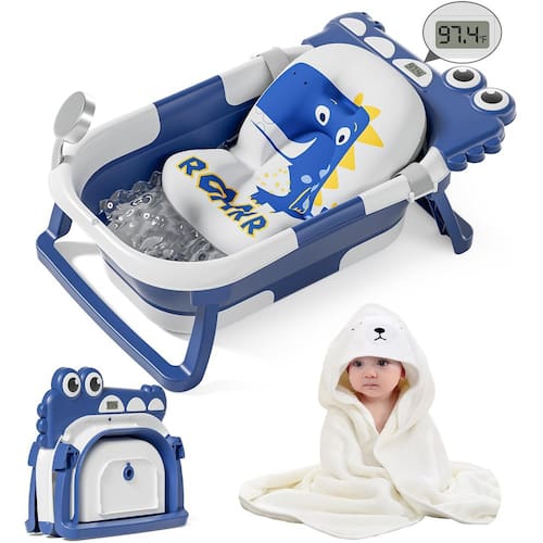 Banheira dobrável para bebês recém-nascidos com termômetro e 1 almofada flutuante macia e orifício de drenagem, banheira de viagem dobrável e portátil para bebês de 0 a 36 meses - ?Compacta e dobrável?Nossa banheira de bebê atualizada pode ser dobrada sem esforço em apenas dois passos até uma espessura de menos de 10 cm. Ele ainda se dobra ao meio, permitindo armazenamento conveniente em qualquer canto, tornando-o uma solução que economiza espaço. - ?Design inteligente?Ao contrário de banheiras comuns, nossa banheira infantil possui um sensor de temperatura em tempo real, garantindo o conforto e o bem-estar do seu bebê. O sistema de temperatura surround lock minimiza a perda de calor. O ralo off-ground com um plugue de borracha fácil de puxar simplifica a drenagem da água sem mover a banheira. - ?Presentes premium gratuitos imperdíveis?Brindes duplos, 1, toalha com capuz super macia para bebês (avaliada em pelo menos US $15,99 se comprada separadamente), não apenas para banhos, mas também como cobertor, cueiro ou capa de trocador. 2, uma almofada flutuante, esta almofada é cuidadosamente projetada para imitar o útero, oferecendo suporte suave para o desenvolvimento da coluna do seu bebê. - ?Material premium?A banheira dobrável é projetada para acompanhar seu bebê de recém-nascido a criança (0 a 36 meses). Feita com materiais premium PP+TPE, nossa banheira infantil garante segurança, resiliência e tranquilidade. Sem odor e à prova de mordidas, é suave para a pele do seu bebê. - ?Garantia pós-venda? Dê a qualquer futuro pai o presente maravilhoso desta banheira portátil, uma companhia durável para seus filhos até a idade de 2 anos. Se você tiver alguma dúvida sobre o produto, sinta-se à vontade para entrar em contato conosco, nossa equipe de atendimento 24 horas está sempre pronta para ajudá-lo.
