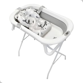 Este modelo da linha Bubbly se destaca por seu suporte elevado, que eleva a banheira a uma altura confortável para os pais, evitando que você precise se curvar. Essa característica torna o banho mais leve para quem cuida, reduzindo o esforço e protegendo a coluna. Além disso, a banheira dobrável — tanto na parte plástica quanto no suporte — facilita o armazenamento e torna o conjunto extremamente prático, ideal para espaços pequenos ou para viagens.