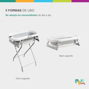 Conta com estrutura ergonômica e termômetro embutido, permitindo o controle ideal da temperatura da água. Almofada suporte de poio interno acolchoado removível oferece maior conforto ao bebê durante o banho, enquanto as 4 fivelas de segurança e os pés com base antiderrapante garantem firmeza e estabilidade ao suporte dobrável em aço.