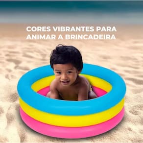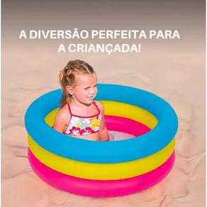 Capacidade: 88 litros. Dimensões: Diâmetro de 86 cm e altura de 25 cm. Material: PVC de alta durabilidade com três anéis infláveis. Idade recomendada: A partir de 12 meses. Ideal para ambientes externos ou internos com supervisão.