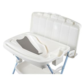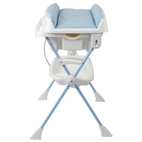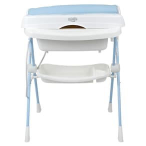 Pensando também na rotina dos pais, o modelo vem com mangueira para escoamento de água, porta-toalha lateral, suporte dobrável com estrutura metálica leve e resistente, além de gancho para pendurar e guardar sem ocupar espaço. O design em azul claro com detalhes em branco traz um visual delicado e moderno ao ambiente.
