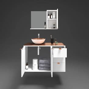 Itens inclusos: - Cuba Inclusa - Espelho Incluso - Espelheira de Madeira - Gabinete de Madeira