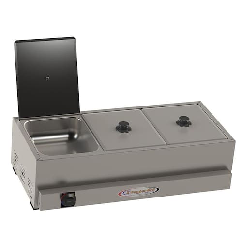 A molheira a gás banho maria é indicada para acomodar carnes, molhos salsichas e muitos outros alimentos que necessitem serem servidos quentes. Pode ser utilizado em restaurantes, bares, lanchonetes, hotéis, pousadas, buffets e muitos outros estabelecimentos. Sua estrutura é confeccionada em chapa de aço inox 430 escovado, garantindo muito mais durabilidade e resistência a molheira a gás. Conta com um sistema de acendimento dos queimadores através de gaveta, proporcionando muito mais segurança aos usuários. Além disso, possui 3 cubas, sendo 2 cubas de 5 litros cada e 2 de 2,5 litros cada com capacidade máxima de óleo de 4 litros para as de 5 litros e 2 litros para a de 2,5 litros para que não haja derramamento de ingredientes ao utilizar o banho maria a gás.