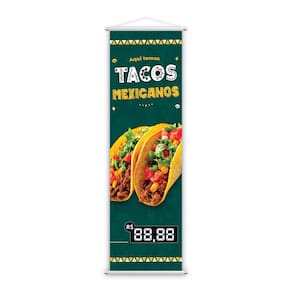 Design: O design do banner é vibrante e colorido, com a frase Aqui Temos Tacos Mexicanos em letras grandes e chamativas, acompanhada de ilustrações que evocam a rica cultura mexicana. As cores são cuidadosamente escolhidas para transmitir a alegria e a autenticidade da gastronomia mexicana, tornando-o não apenas um sinal, mas também uma peça decorativa que enriquece o ambiente.