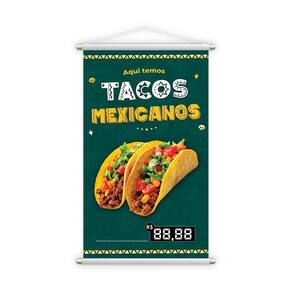 Design: O design do banner é vibrante e colorido, com a frase Aqui Temos Tacos Mexicanos em letras grandes e chamativas, acompanhada de ilustrações que evocam a rica cultura mexicana. As cores são cuidadosamente escolhidas para transmitir a alegria e a autenticidade da gastronomia mexicana, tornando-o não apenas um sinal, mas também uma peça decorativa que enriquece o ambiente.