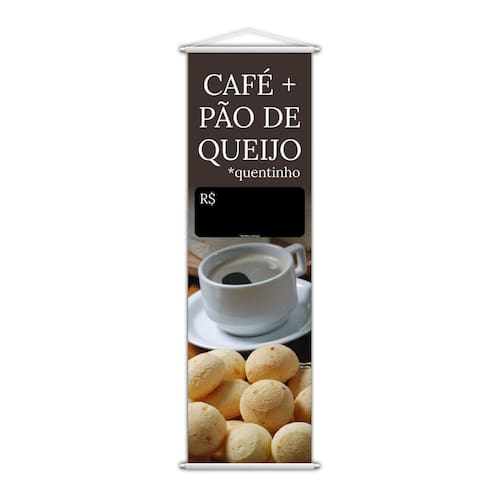 Com sua lona resistente, bastões de madeira e corda para pendurar, o banner Café e Pão de Queijo é uma solução prática, durável e visualmente atraente para quem deseja promover esse clássico saboroso de maneira simples, elegante e eficiente. Não perca a oportunidade de criar um ambiente acolhedor e convidativo, destacando sua oferta com estilo
