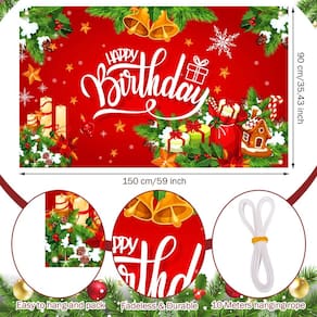 - Item de banner de aniversário de Natal ideal: o pacote vem com 1 peça de banner de aniversário de Natal e 1 rolo de corda que mede cerca de 10 metros/32,8 jardas de comprimento, que se adapta ao tema do Natal e do aniversário, e pode facilmente atender às suas necessidades de decoração de aniversário