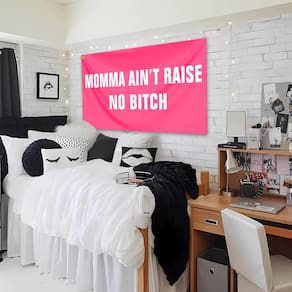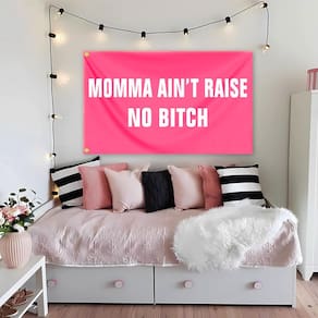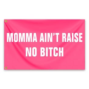 1 - Material de la bandera divertida para habitación: Las banderas "Momma aint raise no bitch" para habitación están hechas de poliéster suave y duradero de alta calidad, impermeable y con revestimiento resistente a los rayos UV, por lo que su uso prolongado no desvanecerá la bandera. - Tamaño: La bandera "Momma aint raise no bitch" para adolescentes mide 91x152 cm (3x5 pies) y cuenta con 2 anillas de cobre sólido. - La bandera rosa "Momma Aint Raise No Bitch" es simple y sofisticada, tiene diseño doble cara con impresión espejo visible en ambos lados, los colores son muy vivos, perfecta para sala, dormitorio, dormitorio de adolescentes, llamando fácilmente la atención. - Regalo Único: Puedes regalarla a familiares y amigos en Día de San Valentín, Acción de Gracias, Halloween, fiestas, inicio de clases, Navidad, Año Nuevo, o colgarla en la pared del dormitorio. - Nuestro póster "Momma Aint Raise No Bitch" facilita su instalación y remoción. La tela ligera y fluida permite que ondee aún con brisa ligera, para mostrarla con orgullo en el exterior.