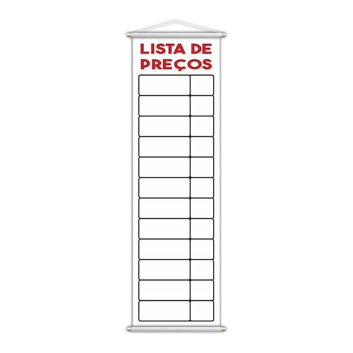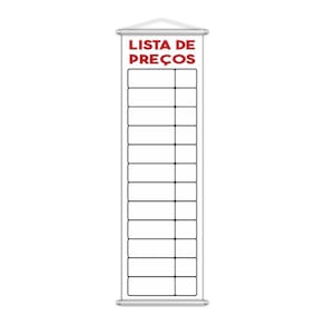 O banner Lista de Preços é uma peça prática e funcional, ideal para quem precisa apresentar informações de forma clara e atrativa em diversos ambientes. Com o tamanho de 100x30cm, essa peça é perfeita para ser colocada em lojas, mercados, restaurantes, escritórios ou qualquer outro tipo de estabelecimento que precise exibir preços ou promoções de maneira destacada e organizada. Seu design simples, mas eficiente, permite que a mensagem seja facilmente visualizada, tornando-o um item essencial para o dia a dia comercial. Feito com lona de 340g, um material de alta qualidade e resistência, o banner oferece uma durabilidade excepcional. A lona é resistente ao desgaste, garantindo que a peça mantenha sua integridade e aparência, mesmo com o uso constante. A impressão direta sobre a lona garante uma imagem nítida e cores vibrantes, que permanecem intactas ao longo do tempo, mesmo quando expostas a diferentes condições de iluminação e ao longo do uso. A lona de 340g também proporciona uma ótima resistência a intempéries, tornando a peça adequada para ambientes internos e externos. O acabamento do banner é cuidadosamente elaborado para garantir tanto a funcionalidade quanto a estética. Nas extremidades superior e inferior, o banner conta com bastões de madeira, que proporcionam estrutura e estabilidade à peça. Esses bastões mantêm o banner esticado e alinhado, garantindo que as informações exibidas permaneçam claras e visíveis. A madeira adiciona um toque rústico e sofisticado ao produto, combinando perfeitamente com o estilo prático e funcional da peça. Na parte superior, uma corda resistente é fixada para facilitar o processo de pendurar. A corda não só torna a instalação rápida e prática, mas também acrescenta um charme decorativo, com um toque rústico que complementa o design da peça. Seja para ser colocado em uma parede, em uma ou pendurado em qualquer espaço, o banner pode ser facilmente fixado, tornando-o ideal para ambientes comerciais e promocionais. Ideal para exibir listas de preços, promoções ou qualquer outra informação que precise ser acessada rapidamente, o banner Lista de Preços é uma solução prática, durável e visualmente atraente para quem deseja organizar e destacar seus preços ou ofertas de maneira simples e eficiente. Sua combinação de lona resistente, bastões de madeira e corda para pendurar garante não apenas a funcionalidade, mas também um toque de charme e rusticidade, que fará a diferença em seu espaço comercial. Se você precisa de uma forma eficaz e estilosa de exibir suas listas de preços, o banner Lista de Preços é a escolha ideal para quem busca uma solução prática e de qualidade, sem abrir mão do estilo e da durabilidade.