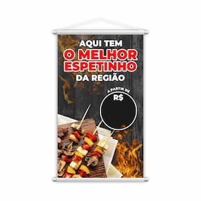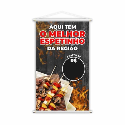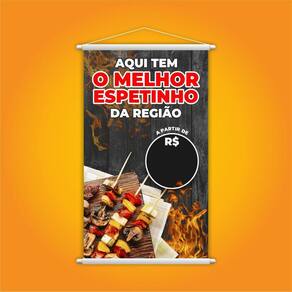 Banner Melhor Espetinho Carne Preço Fundo Preto GrandeTAMANHO:Banner com medida total de 120x60cmACABAMENTO:Bastões de madeira + corda na parte superior.