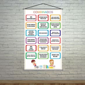 Banner Pedagógico Escolar - Combinados 80X50Cm TAMANHO: Banner com medida total de 80x50cm ACABAMENTO: Bastões de madeira + corda na parte superior. Atualmente existem diversas formas de aprendizado e a modernidade facilita e ajuda no desenvolvimento de cada passo escolar e pedagógico de uma criança. O banner pedagógico é uma delas, uma ótima forma de incentivar e começar a trabalhar a mente e praticar o aprendizado. Desenvolvemos diversos modelos de banners e cada um deles oferece apoio e ajuda no desenvolvimento em várias áreas. Quer ajudar os seus alunos a desenvolver esses aprendizados Os Banners Pedagógicos são excelentes para trabalhar de uma forma interativa o desenvolvimento dos alunos, facilitando na hora de ensinar e memorizar cada passo.