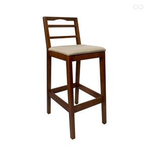 CARACTERÍTICAS TÉCNICAS: - Produzido em Madeira Maciça; - Acabamento em Verniz na cor Castanho; - Assento Preenchido com Espuma D26; - Encosto Ripado; - Revestimento em Linho na cor Bege. *Indicada para Bancadas/Mesas com Alt. 100/105cm.
