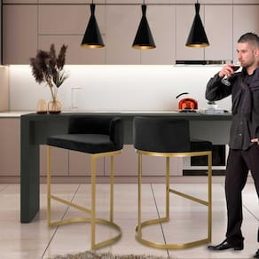 Banqueta Alta Estofada Estrutura Aço Carbono Belly II Base Dourada 75cm Suede Preto - Esta Banqueta é a definição da elegância moderna