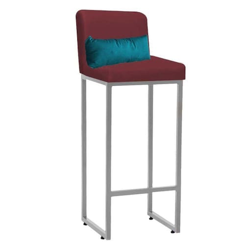 Banqueta Alta Com Encosto Lucca Industrial Cozinha Balcão Ferro Prata Suede Bordô E Almofada Azul Turquesa - Ahazzo Móveis Cor Azul Turquesa