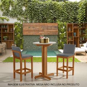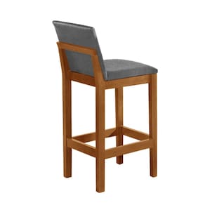 Banqueta Alta Luxo Pérola com Encosto Estofada em Linho Cinza Madeira Maciça Castanho