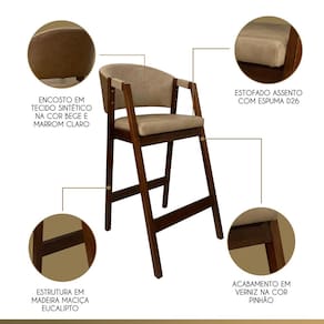 CARACTERÍSTICAS TÉCNICAS: - Produzido em Madeira Maciça; - Acabamento Verniz na Cor Capuccino; - Assento com Espuma D26; - Encosto com Espuma D23; - Revestido em Tecido Material Sintético na Cor Bege e Marrom.