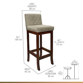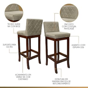 A banqueta Tóquio é a fusão perfeita entre requinte e comodidade. Fabricada com madeira maciça proveniente de reflorestamento e acabamento em verniz, sua estrutura promove durabilidade e um charme natural. O assento, preenchido com espuma D26, e o encosto, com espuma D23, proporcionam um suporte ergonômico incomparável. O toque de elegância é evidenciado pelo detalhe da costura matelassê no encosto, enquanto o revestimento em suede adiciona um acabamento luxuoso. A banqueta Tóquio é a escolha ideal para elevar o conforto e a sofisticação de qualquer ambiente. CARACTERÍTICAS TÉCNICAS: - Produzido em Madeira Maciça de Reflorestamento; - Acabamento em Verniz na cor Castanho; - Assento Preenchido com Espuma D26; - Encosto Preenchido com Espuma D23; - Encosto com Costura Matelassê; - Revestimento em Suede na cor Bege. *Indicada para Bancadas/Mesas com Alt. 100/105cm. *PRODUTO ENVIADO MONTADO. INFORMAÇÕES TÉCNICAS: Altura Total: 100 Cm Altura até Assento: 75 Cm Altura até Travessa: 23 Cm Altura Encosto: 35 Cm Largura Assento: 38 Cm Largura Estrutura: 36 Cm Profundidade Total: 42 Cm Profundidade Assento: 41 Cm Peso: 7 kg INFORMAÇÕES ADICIONAIS: ATENÇÃO: Móvel produzido em madeira maciça natural podendo ocorrer mudança no tom da madeira conforme o produto. *Conferir se o produto está de acordo com o que comprou, produto danificado não será aceito troca. **As imagens ambientadas são meramente ilustrativas e podem apresentar itens que não compõe o produto. As cores do produto podem variar de acordo com o monitor, a iluminação do ambiente ou sua percepção visual. ***Limpeza deve ser feita com pano macio e seco ou levemente umedecido com água e sabão neutro. Não devem ser utilizados produtos abrasivos. Garantia para defeitos de fabricação conforme Código de Defesa do Consumidor. Marca: CCS Interiores