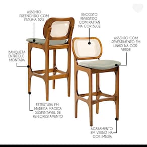 A Banqueta Alta Decor é o modelo ideal para complementar o seu ambiente. Dispõe de um design atual com assento estofado e encosto em rattan. As banquetas são móveis versáteis que podem ser utilizados em diversos ambientes e funcionalidades, permitindo composições na decoração e agregando conforto e sofisticação ao ambiente. Podem ser utilizadas em bancadas de salas conjugadas, mesas bistrô em sacadas gourmet ou aonde você precisar. Produzida com madeira maciça, garantindo a sua durabilidade e vida útil. CARACTERÍSTICA TÉCNICAS: - Produzido em Madeira Maciça Sustentável - Acabamento em Verniz na cor Imbuia - Assento Estofado Preenchido com Espuma D23 - Encosto com Revestimento em Rattan em Fibra de Algodão Sextavada na cor Bege - Tecido de Alta Qualidade em Linho na cor Verde L84 - Banqueta Entregue Montado INFORMAÇÕES TÉCNICAS: - Altura Total: 104 cm - Altura até o Assento: 75 cm - Largura Total: 50 cm - Profundidade Total: 54 cm Informações Adicionais: Garantia para defeitos de fabricação conforme Código de Defesa do Consumidor. *ATENÇÃO: Não nos responsabilizamos pela montagem, subir ou içar o móvel. *As imagens ambientadas são meramente ilustrativas e podem apresentar itens que não compõe o produto, as cores do produto podem variar de acordo com o monitor, a iluminação do ambiente ou sua percepção visual. *Limpeza: Deve ser feita com pano macio e seco ou levemente umedecido com água e sabão neutro. Não devem ser utilizados abrasivos.