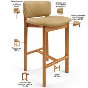 Características: Estrutura em madeira de reflorestamento Taeda com acabamento envernizado na tonalidade Castanho. Revestimento em Couríssimo Fend. Encosto com acabamento em debrum. Assento estofado fixo composto por espuma D-26. Suporta até 150 kg. Produto entregue montado.