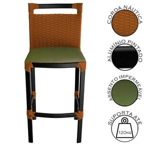 Banqueta Alta Vigor Em Alumínio E Corda Náutica Ocre Ocre Com Verde A Banqueta Vigor acrescenta um charme unico a qualquer espaco, sendo ideal para quem busca combinar funcionalidade e estilo em ambientes externos. Produzida com material de alta qualidade e feita de forma artesanal. Sua estrutura e composta por aluminio e acabamentos em corda nautica, combinando durabilidade com estilo contemporaneo. Possui encosto fixo em corda nautica, que oferece um apoio confortavel enquanto adiciona um toque de design unico. Alem disso, o assento e estofado impermeavel garantindo conforto e praticidade, sendo adequada para areas externas, como areas gourmet, espacos de churrasqueira, ediculas e outros ambientes ao ar livre. ESPECIFICACOES TECNICAS: - Material da Estrutura: Aluminio; - Material do Assento: Estofado impermeavel; - Material do Encosto: Corda nautica; - Possui Braco? Nao; - Possui Regulagem de Altura? Nao; - Quantidade de Lugar: 01 Lugar; - E Giratoria? Nao; - Suporta ate: 120 kg; - Garantia: 3 Meses; - Necessita de Montagem: Nao; - Instrucoes de Cuidado: Nao utilizar produtos quimicos na fibra e nem na estrutura para limpeza, somente pano macio umedecido com agua e sabao neutro; - Dimensoes do Produto (LarguraXProfundidadeXAltura): 45x45x110cm; - Conteudo da Embalagem: 01 Banquetas; Marca: ACESSE MÓVEIS