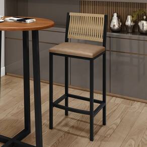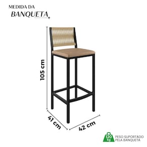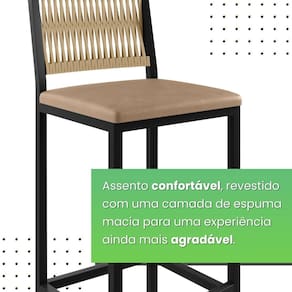 A banqueta com assento estofado oferece conforto excepcional, enquanto o encosto em corda náutica adiciona um toque de estilo contemporâneo e durabilidade. Sua estrutura em aço robusto garante estabilidade e longa vida útil, sendo ideal para diversos ambientes. Os apoios para os pés proporcionam ergonomia e conforto adicional, tornando esta peça perfeita para cozinhas, bares, áreas gourmet e bancadas. Acabamento da Estrutura: Pintura Altura do assento até o chão: 75 cm Altura Regulável: Não Ambiente Principal: Cozinha Cor: Preto/Bege Cor do Produto: Preto/Bege Dobrável: Não Escala de Brilho: Semi-Fosco Itens Inclusos: 01 Banqueta Marca: PAONANDA DECOR Material do Assento: MDF Necessita Montagem: Não Origem do Produto: Nacional Peso: 7,4 kg Possui Encosto: Sim Possui Rodízio: Não Recomendações de Uso, Manutenção e Limpeza: Limpe com um pano úmido e detergente neutro, secando bem em seguida. Tipo de Assento: Fixo Tipo de Encosto: Fixo Marca: PAONANDA DECOR