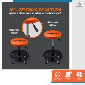 A Banqueta para Mecânico com Assento Giratório da Starfer, uma solução de qualidade superior para profissionais que valorizam conforto e eficiência em suas atividades. Com uma bandeja de aço integrada para ferramentas, base de quatro rodízios giratórios de 2,5" para mobilidade suave, e uma capacidade de até 136kg, essa banqueta oferece durabilidade e praticidade excepcionais. Seu assento laranja é acolchoado para conforto prolongado, enquanto a alavanca de ajuste de altura e as alturas máxima (54,5cm) e mínima (42,5cm) proporcionam personalização. Com um assento de 28cm de diâmetro, esta banqueta é uma escolha notável para melhorar a produtividade e o bem-estar durante tarefas mecânicas e de manutenção.Especificações técnicas:Material da Estrutura: Aço CarbonoTipo de Assento: GiratórioCor do Assento: LaranjaDiâmetro do Assento: 28cmPossui Rodizio: Sim, 4 de 2,5" (64mm)Material do Rodizio: NylonCapacidade: 136Kg (300lb)Altura da Banqueta: 54,5cm (máxima) x 42,5cm (mínima)Ref.: 2005042Marca: Starfer