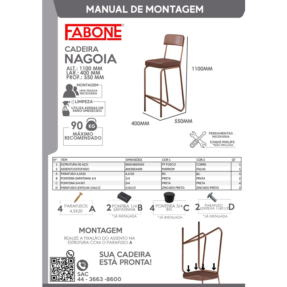 Aço CarbonoO assento é estofado com espuma D20, garantindo maciez e excelente apoio para o uso prolongado. Revestido em Corano sintético na cor marrom, o acabamento facilita a limpeza e confere um toque sofisticado ao ambiente. O encosto também conta com espuma para maior conforto ergonômico.