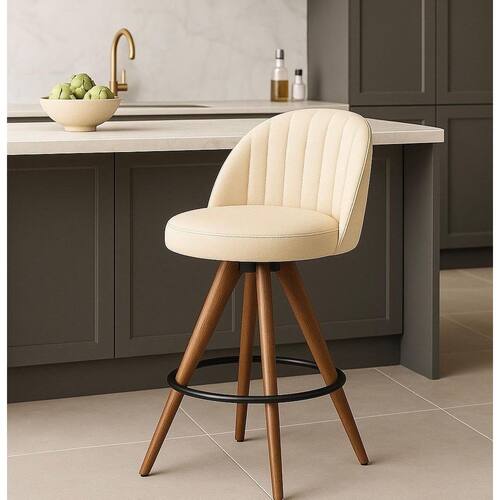 Banqueta Giratória com Assento Estofado e Base em Madeira – Lara Exclusiva Courino Durango Palha -