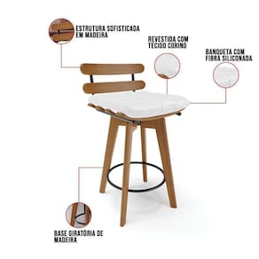 Banqueta Giratória Costela Corino Base Madeira Branco